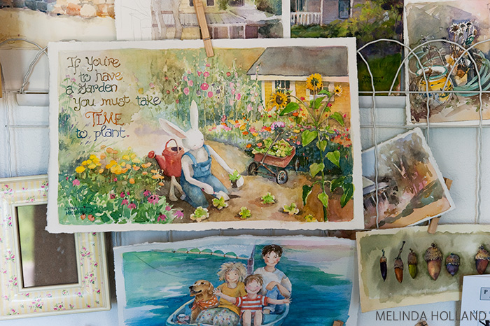 Two weeks ago I spent an inspiring Sunday with artist Shona Macomber. Her paintings and illustrations are absolutely beautiful. Although Shona is skilled in both acrylic and watercolor, I’ve always been a fan of watercolor for it’s fresh and unpredictable ways. I once took a course in watercolor and, well, let’s just say I’m quite terrible at it! My mind just doesn’t think the way you have to think when painting with watercolors. It’s an unforgiving medium so I am in awe whenever I see a well-done, professional grade watercolor painting. Which is what you get when Shona paints her lovely, timeless, idyllic and whimsical scenes. Peruse her site here and, while you’re at it, go ahead and buy a couple paintings! More photos to come from my day spent with Shona!