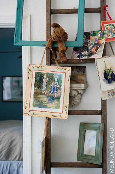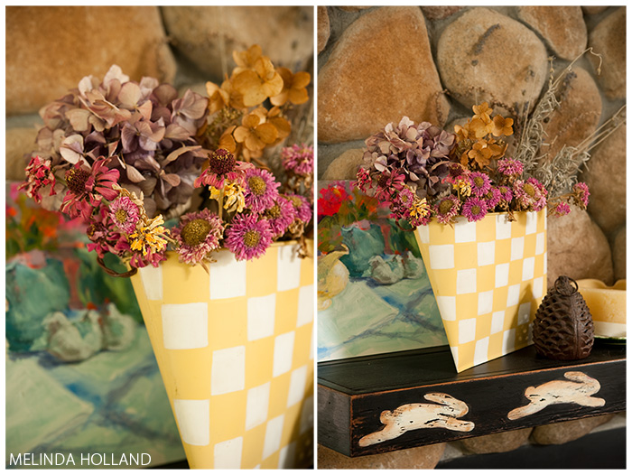 Beautiful dried flowers on the fireplace mantel. Isn’t that yellow-white checked container cute? And look at those bunnies leaping across the front of the mantle! Love that aged, antique paint look. See what I mean when I say Shona’s place is whimsical and inspiring?!